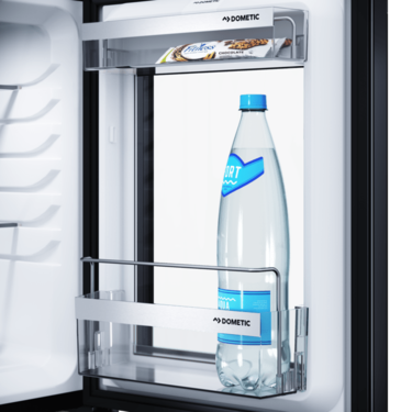 Model Dometic HiPro Evolution N30S wyróżnia się nowoczesnym frontem z czarnej stali nierdzewnej oraz dobrze zorganizowanym, atrakcyjnie oświetlonym wnętrzem z dwiema półkami z hartowanego szkła o regulowanej wysokości, a także dwiema półkami na drzwiach.
