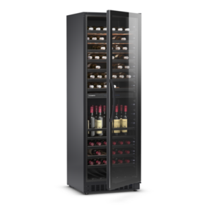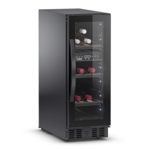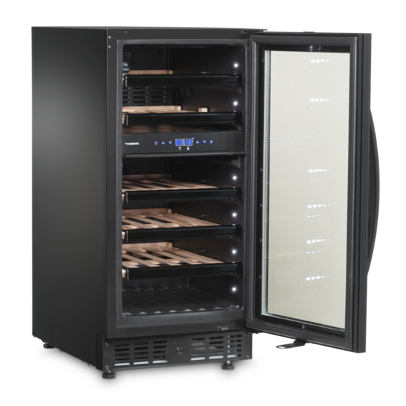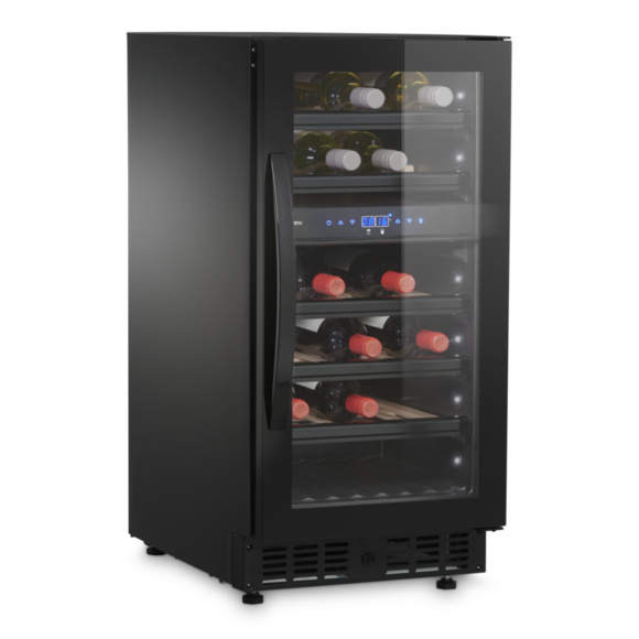 Opis produktu Dwustrefowa chłodziarka na wino ze szklanymi, bezramowymi drzwiami, 28 butelek