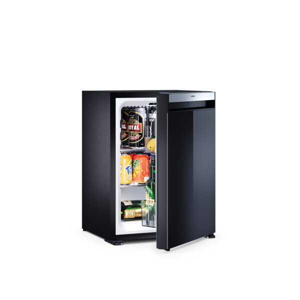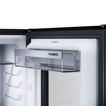 Model Dometic HiPro Evolution N40P wyróżnia się nowoczesnym, lustrzanym czarnym frontem oraz dobrze zorganizowanym, atrakcyjnie oświetlonym wnętrzem z dwiema półkami z hartowanego szkła o regulowanej wysokości, a także dwiema półkami na drzwiczkach.